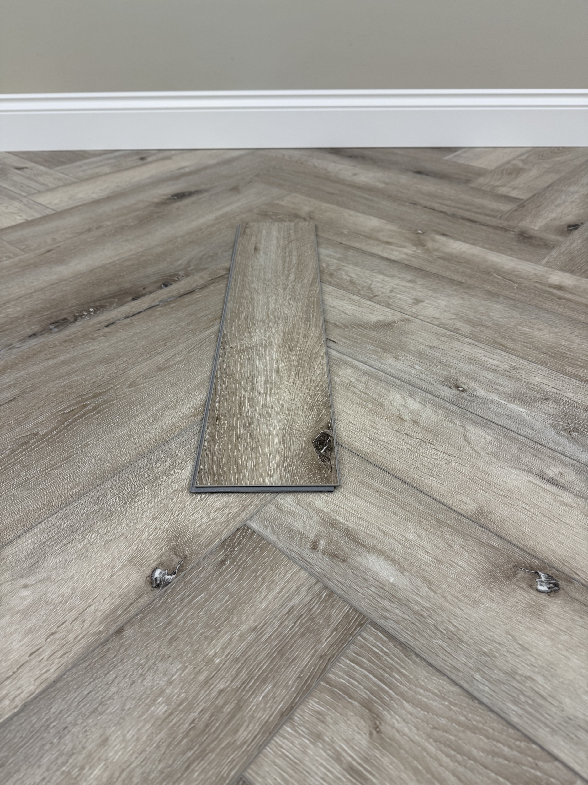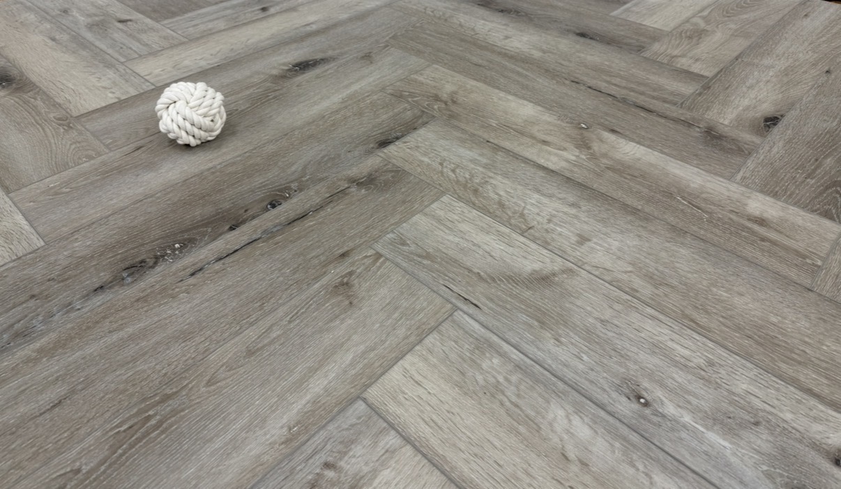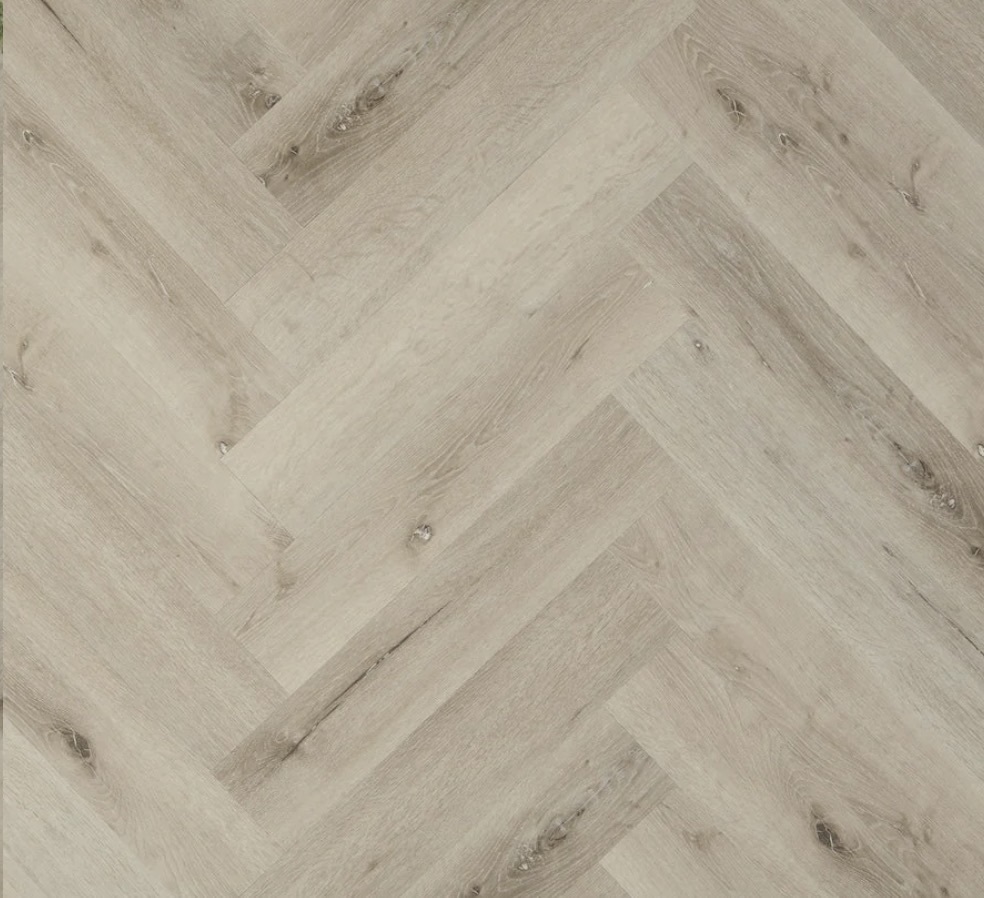 Pebble Oak Herringbone Built-in Underlay. 610mm x 126mm x 5mm