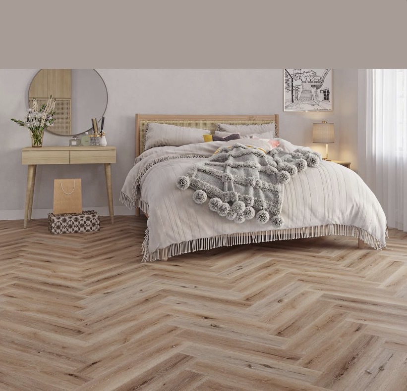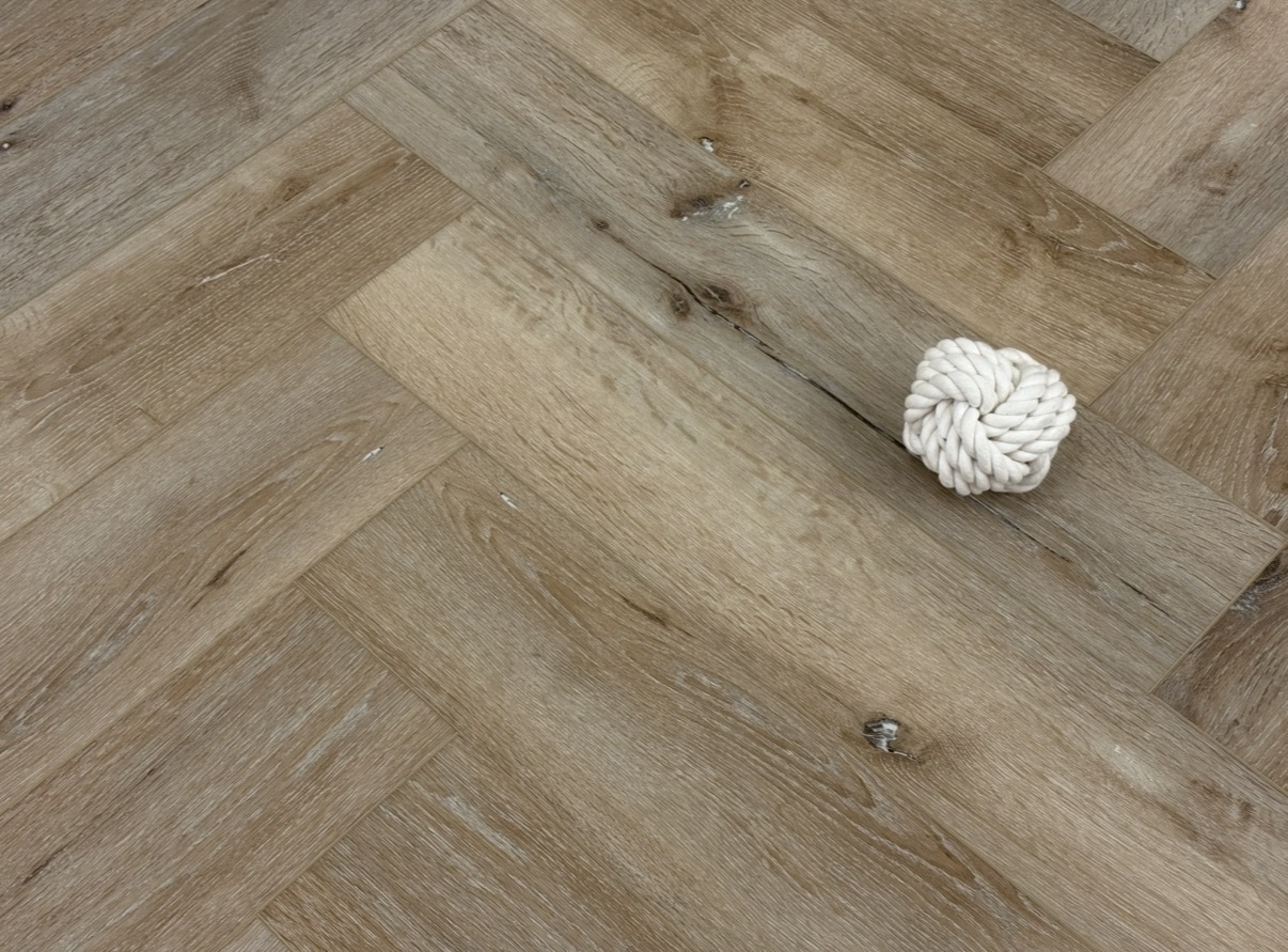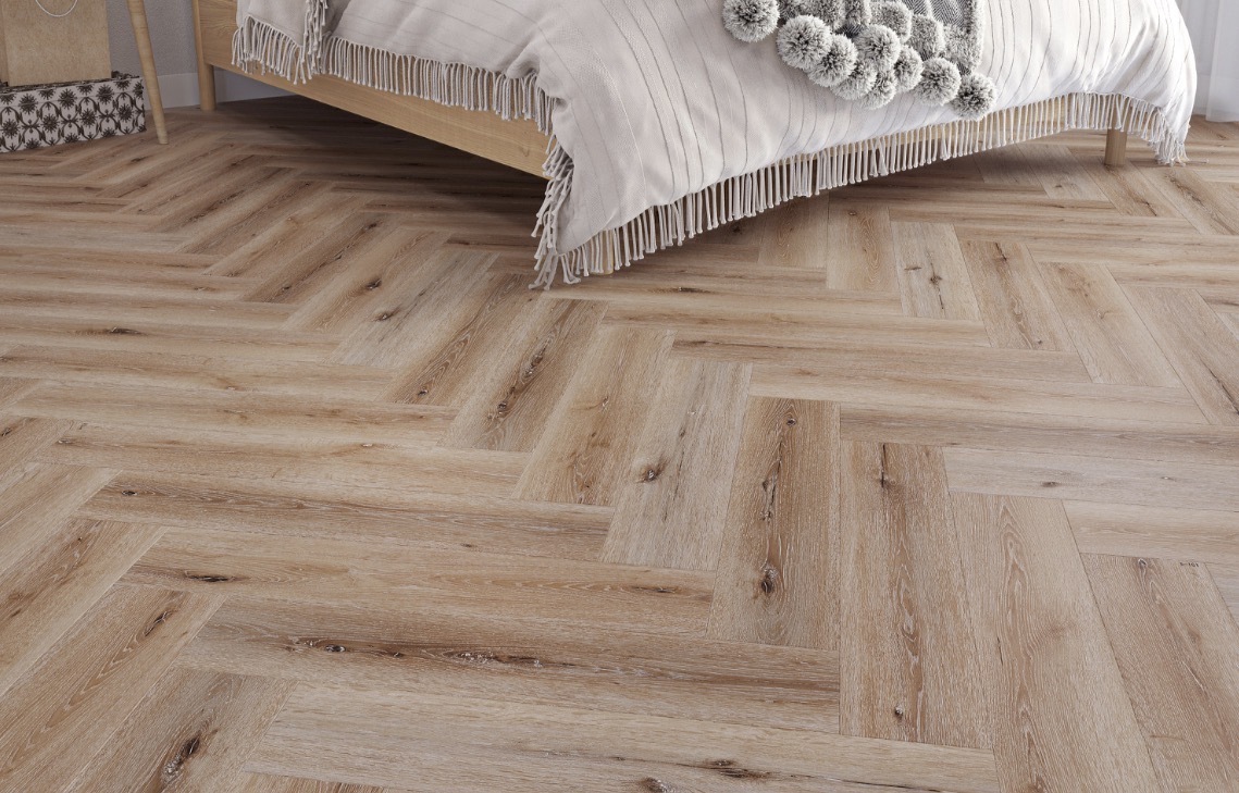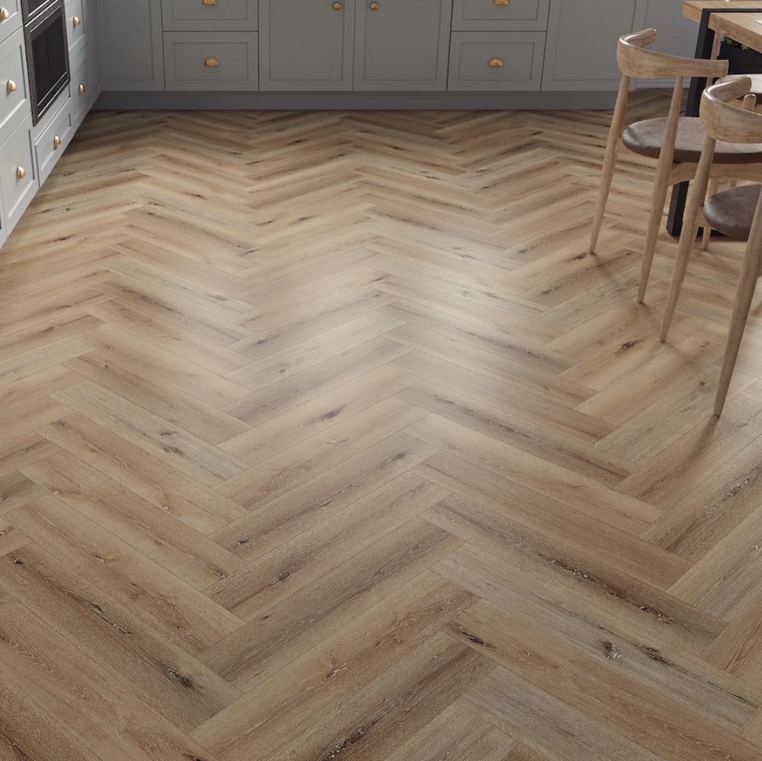 Pebble Oak Herringbone Built-in Underlay. 610mm x 126mm x 5mm