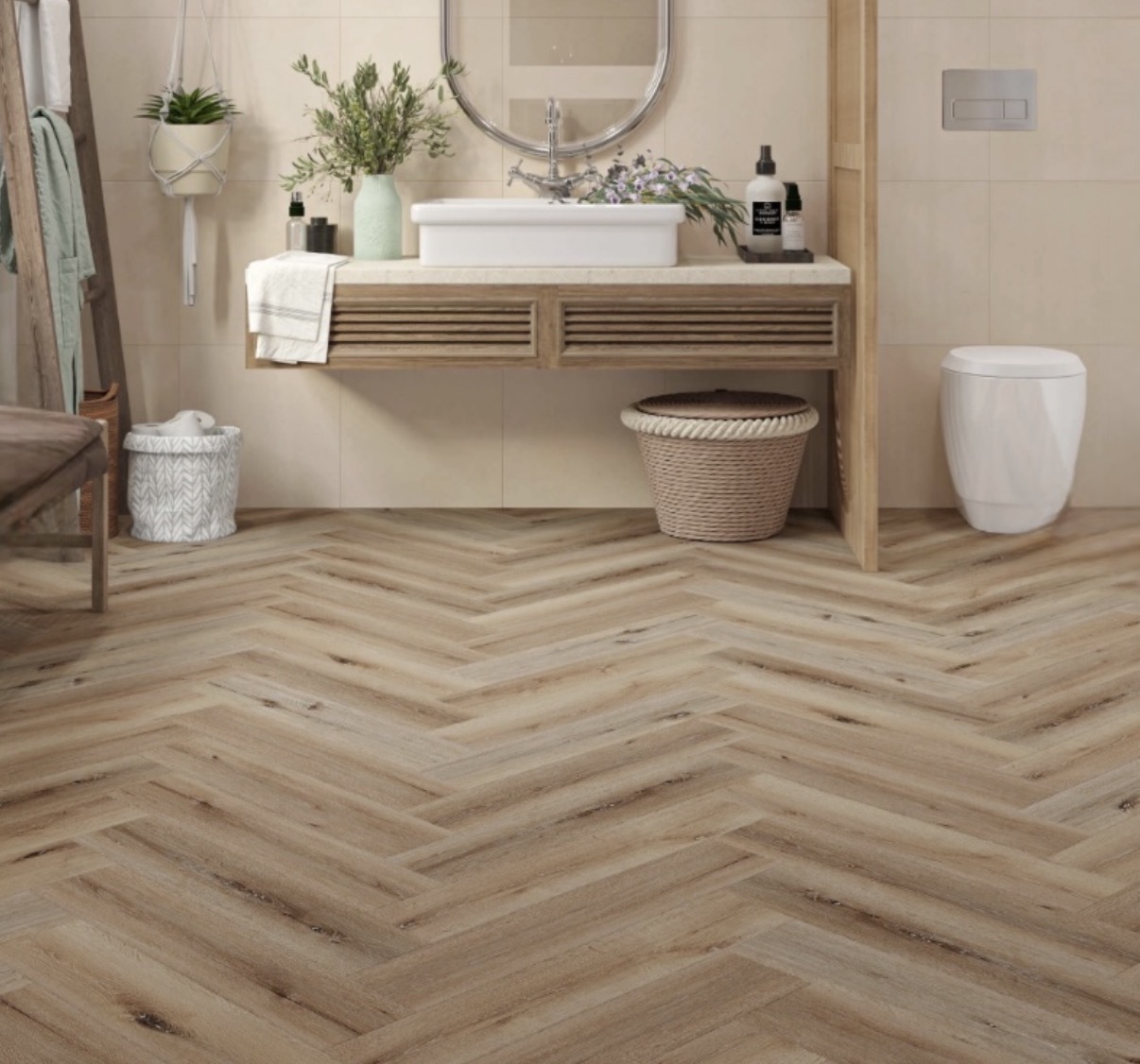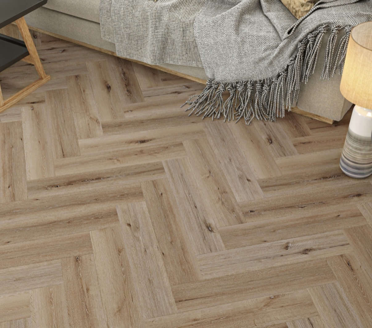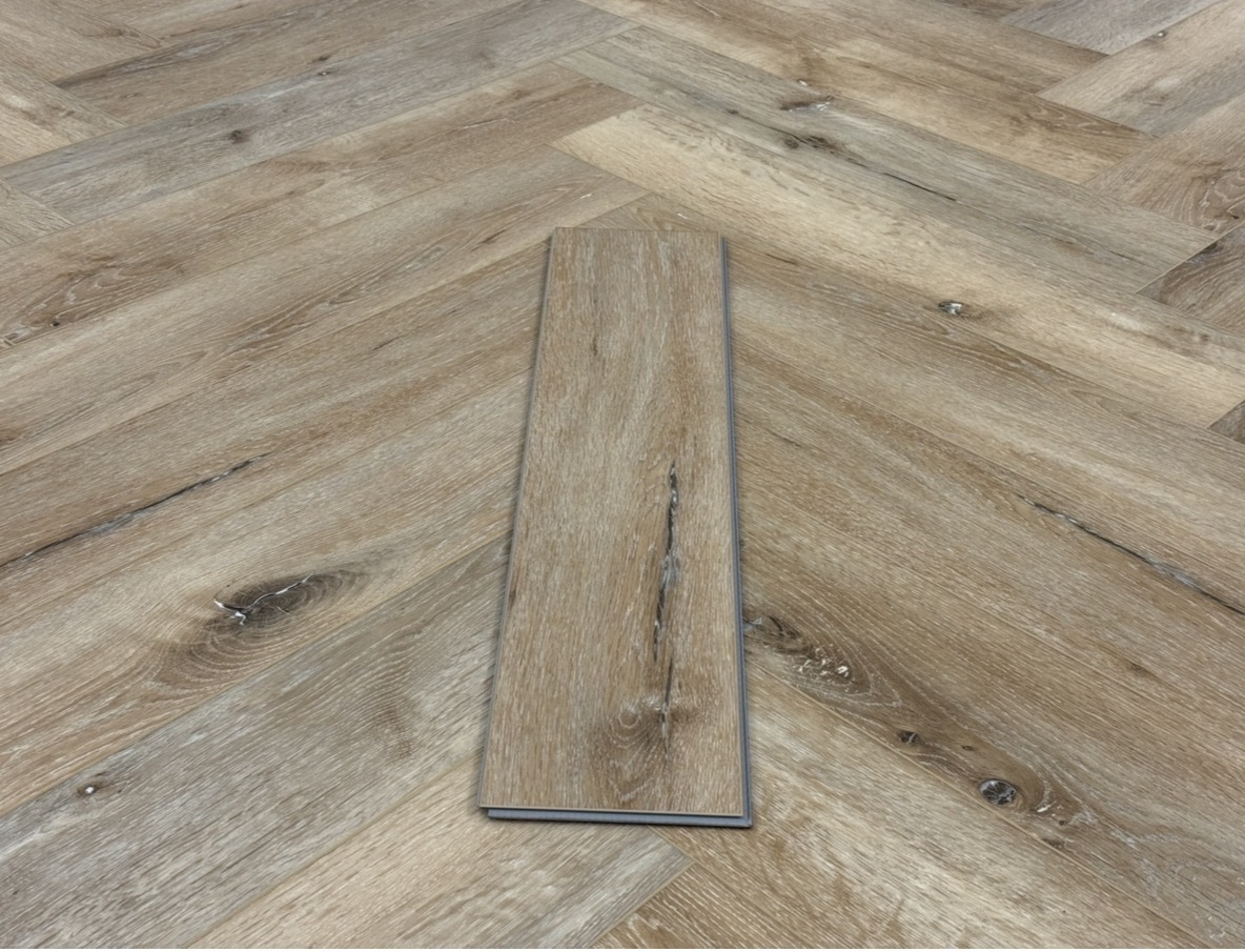 Pebble Oak Herringbone Built-in Underlay. 610mm x 126mm x 5mm